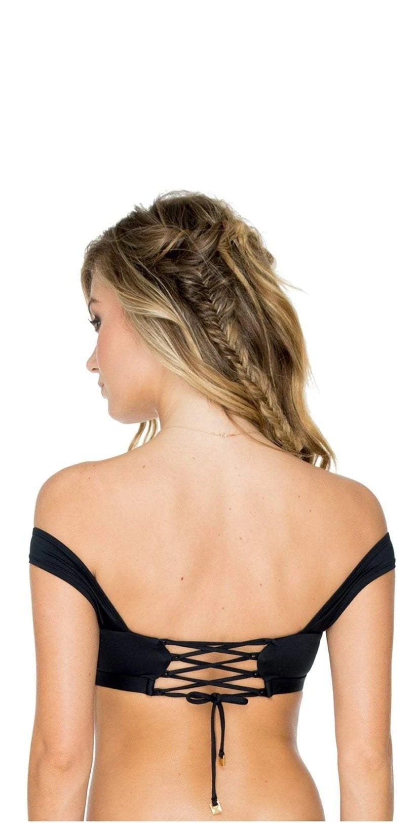 This Aerin Rose Obsidian Zaliya Top In Black is a sexy off the shoulder black top with a lace-up back. This chic and sophisticated top pairs perfect with the matching Obsidian Mercury Bottoms.