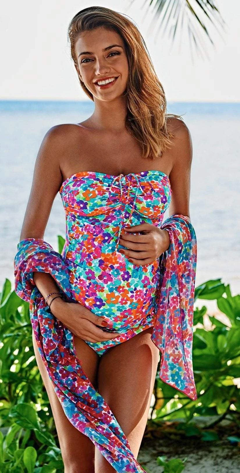 Show your glow in this cheerful Samoa Swimsuit from Anita Maternity. This bandeau style one piece offers a shirred center bust with adjustable tie. Shirring through the torso allows you to grow while flattering your shape. The back has a tie closure with a cut-out detail and full bottom.