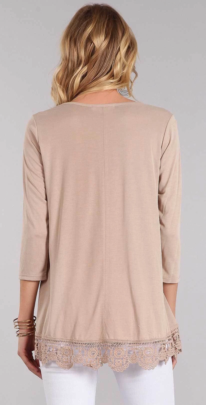 The Chris and Carol Lace Bottom Trim with 3/4 Sleeves In Beige is a flowy, figure flattering shirt that be paired with cute shorts or colored pants. This neutral colored shirt is a versatile shirt that can be worn with anything and anywhere.