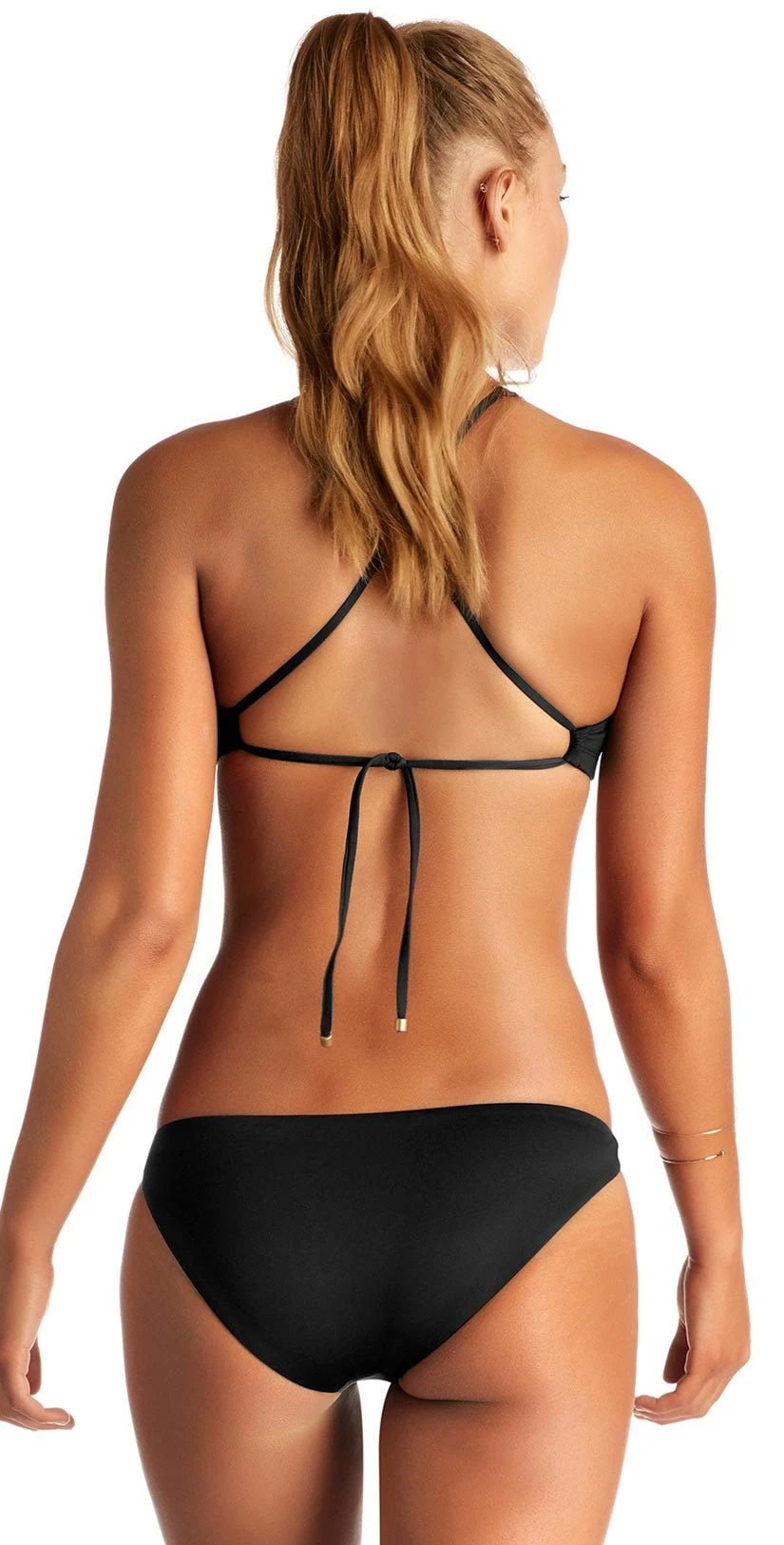 The Vitamin A Cruz EcoLux Cruz Bikini Top in Black features a classy high-neck silhouette with a large keyhole cutout for a peek-a-boo of cleavage. The neck straps continue over the back to crisscross and tie for an adjustable fit. Pair with your favorite Vitamin A Black Bottom from the EcoLux Collection.
