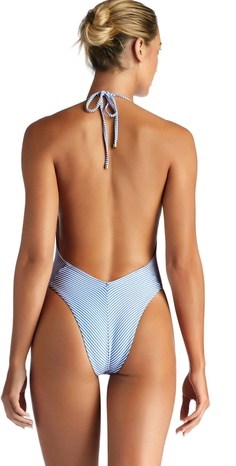 The Vitamin A Demi One Piece Swimsuit in Hamptons Stripe is a sexy, open back seersucker striped suit. With a plunging v-neck, high cut thigh and cheeky bottom, this suit is bound to become your favorite one piece. This suit is fully lined and ties as a halter.